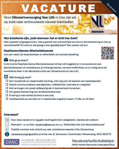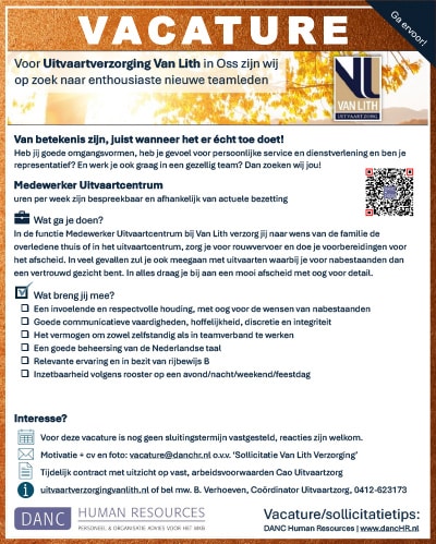 Ter versterking van ons team zijn wij opzoek naar enthousiaste collega’s. Komt u uit Oss of omstreken en wilt u wat betekenen in de uitvaartzorg? Bekijk dan de openstaande vacatures of neem contact met ons op voor meer informatie.