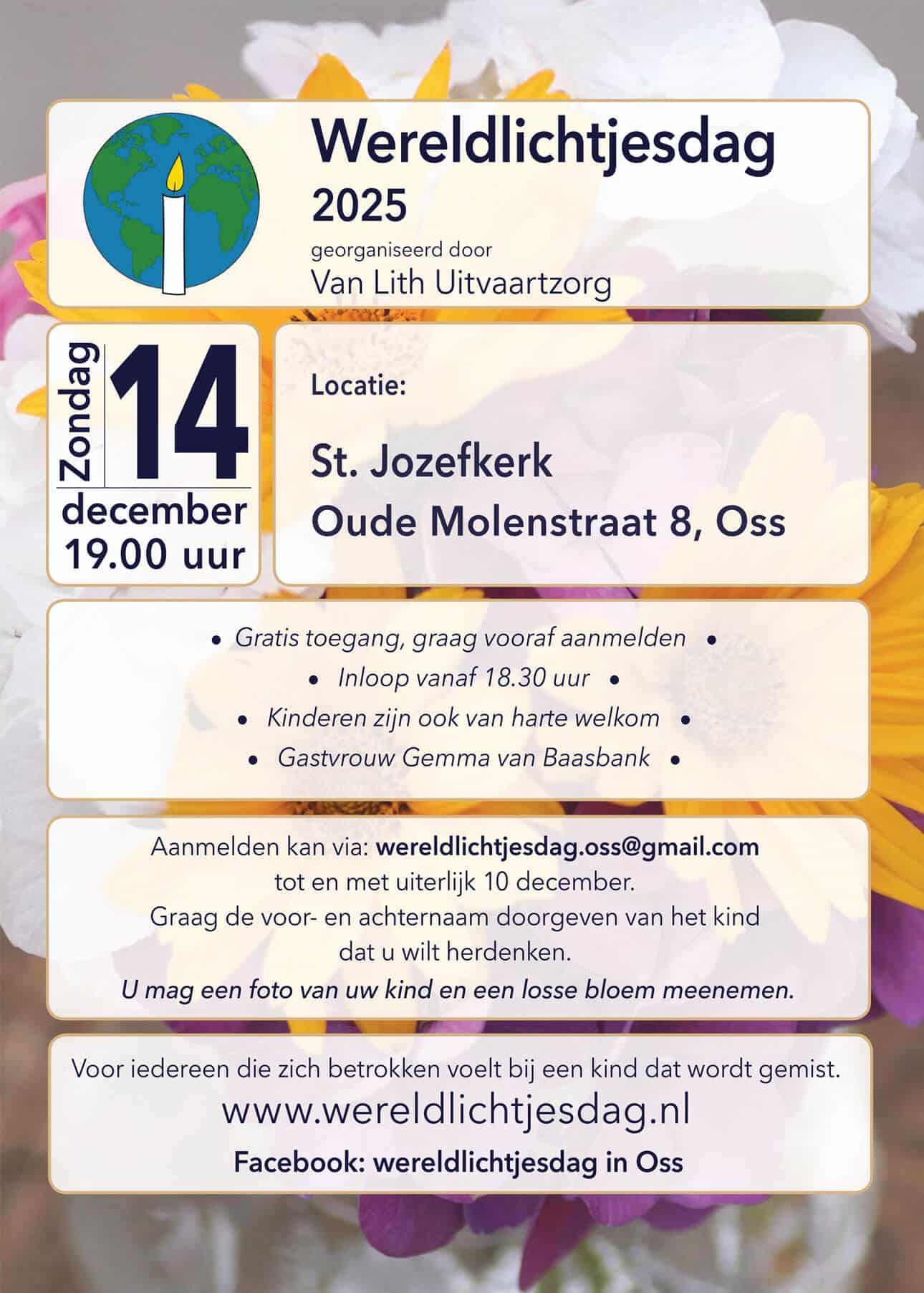 Het is fijn als je je vooraf per mail aanmeldt. Dan staat er een kleinigheidje voor je klaar en weten we hoeveel mensen we kunnen verwachten. Wil je de naam van je kind laten noemen? Dat doen we met liefde. Geef zijn of haar voor- en achternaam graag ook door op emailadres: wereldlichtjesdag.oss@gmail.com. Dit kan uiterlijk t/m 10 december.